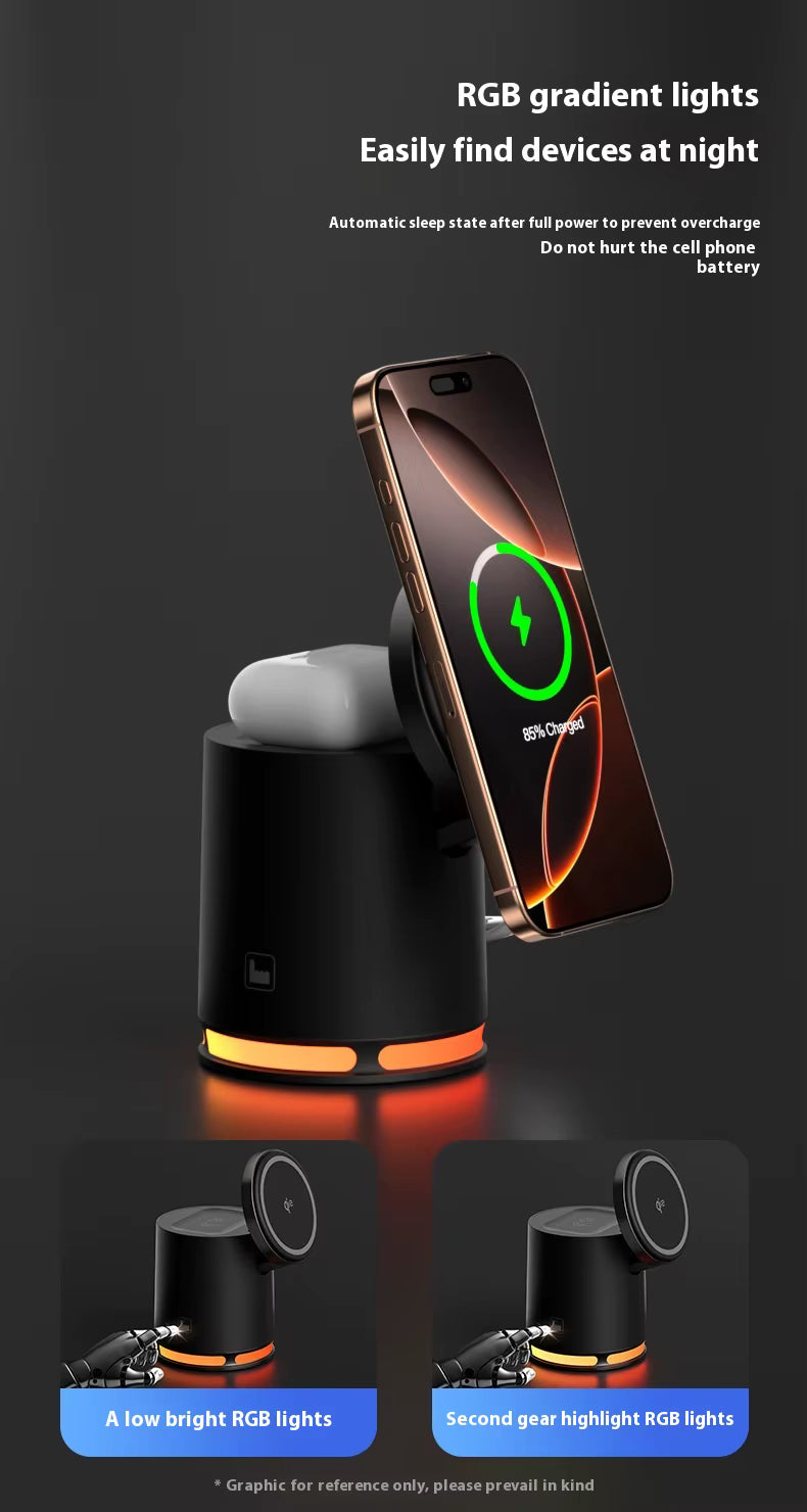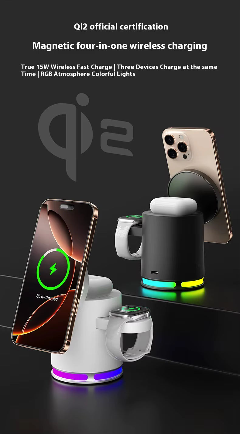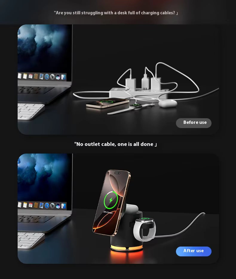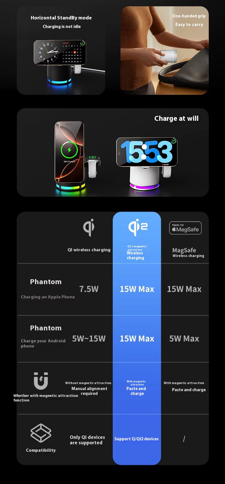 Die Qi2 3-in-1 Ladestation mit Nachtlicht ermöglicht eine nahtlose Verbindung zwischen Ihrem iPhone Pro/Pro Max, Apple Watch und AirPods, um Ihre Geräte effizient zu synchronisieren und aufzuladen.